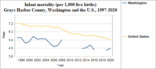An infant is a child under one year of age. The infant mortality rate is calculated by dividing the number of infant deaths by the number of live births. We multiply the result by 1,000. In counties with relatively few people, a small number of infant deaths may have a significant effect on rates from year to year.