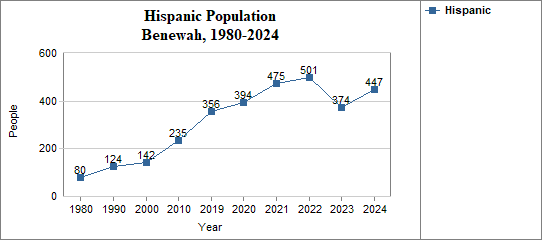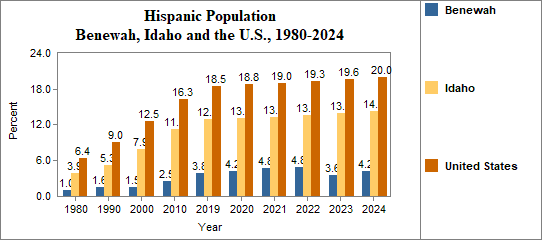 - The proportion of Hispanic residents has changed in Benewah from 1.0 percent in 1980, to 1.6 percent in 1990, to 1.5 percent in 2000, and to 4.2 percent in 2024.