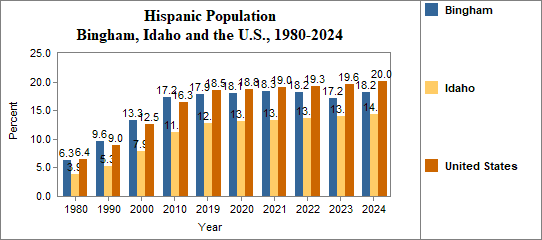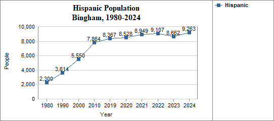 - The proportion of Hispanic residents has changed in Bingham from 6.3 percent in 1980, to 9.6 percent in 1990, to 13.3 percent in 2000, and to 18.2 percent in 2024.