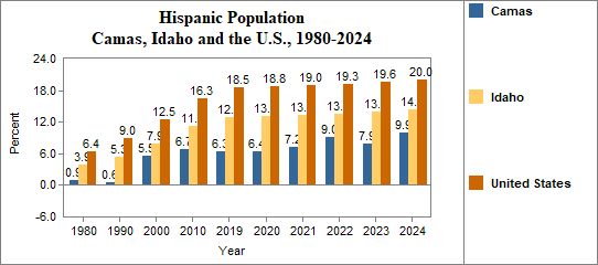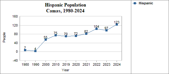 - The proportion of Hispanic residents has changed in Camas from 0.9 percent in 1980, to 0.6 percent in 1990, to 5.5 percent in 2000, and to 9.9 percent in 2024.