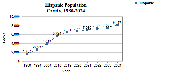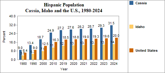 - The proportion of Hispanic residents has changed in Cassia from 9.0 percent in 1980, to 13.4 percent in 1990, to 18.7 percent in 2000, and to 31.5 percent in 2024.