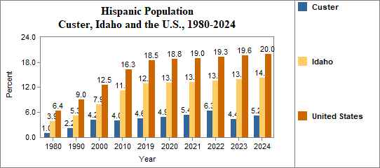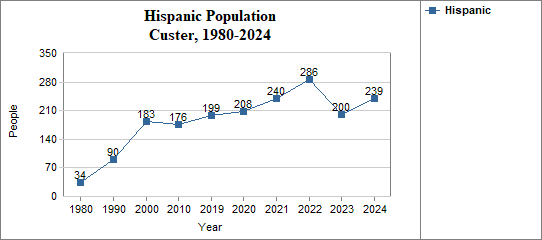 - The proportion of Hispanic residents has changed in Custer from 1.0 percent in 1980, to 2.2 percent in 1990, to 4.2 percent in 2000, and to 5.2 percent in 2024.