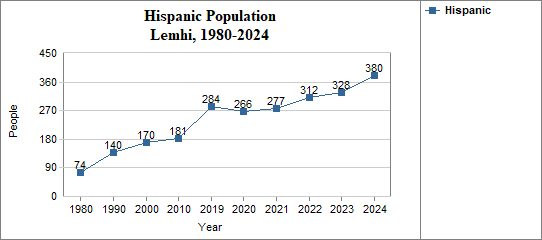 - The proportion of Hispanic residents has changed in Lemhi from 1.0 percent in 1980, to 2.0 percent in 1990, to 2.2 percent in 2000, and to 4.5 percent in 2024.