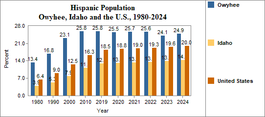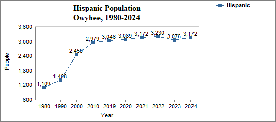 - The proportion of Hispanic residents has changed in Owyhee from 13.4 percent in 1980, to 16.8 percent in 1990, to 23.1 percent in 2000, and to 24.9 percent in 2024.