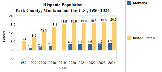 - The proportion of Hispanic residents has changed in Park County from NA percent in 1980, to NA percent in 1990, to NA percent in 2000, and to NA percent in 1900.