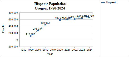 - The proportion of Hispanic residents has changed in Oregon from NA percent in 1980, to 4.0 percent in 1990, to 8.0 percent in 2000, and to 15.5 percent in 2024.