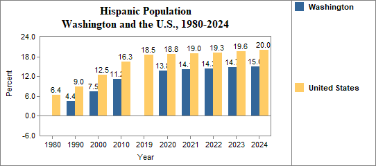 - The proportion of Hispanic residents has changed in Washington from NA percent in 1980, to 4.4 percent in 1990, to 7.5 percent in 2000, and to 15.0 percent in 2024.