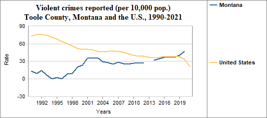 This indicator is calculated by dividing the number of reported incidences of violent crimes by the population. We multiply the result by 10,000. Violent crimes include murders and non-negligent manslaughter, rape, robbery, and aggravated assault. In counties with relatively few people, a small change in the number of violent crimes reported may have a significant effect on rates from year to year. (See the note about data comparability below.)