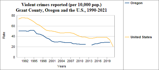 This indicator is calculated by dividing the number of reported incidences of violent crimes by the population. We multiply the result by 10,000. Violent crimes include murders and non-negligent manslaughter, rape, robbery, and aggravated assault. In counties with relatively few people, a small change in the number of violent crimes reported may have a significant effect on rates from year to year. (See the note about data comparability below.)
