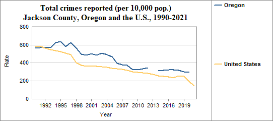 This indicator is calculated by dividing the number of total reported incidences of serious crimes by the population. We multiply the result by 10,000. Total – or serious – crimes include violent crimes (murders and non-negligent manslaughter, rape, robbery, and aggravated assault) and non-violent crimes (burglary, larceny-theft, and motor vehicle theft). In counties with relatively few people, a small change in the number of serious crimes reported may have a significant effect on rates from year to year.