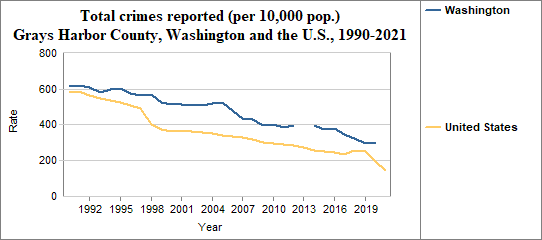 This indicator is calculated by dividing the number of total reported incidences of serious crimes by the population. We multiply the result by 10,000. Total – or serious – crimes include violent crimes (murders and non-negligent manslaughter, rape, robbery, and aggravated assault) and non-violent crimes (burglary, larceny-theft, and motor vehicle theft). In counties with relatively few people, a small change in the number of serious crimes reported may have a significant effect on rates from year to year.