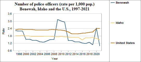 - There were 1.0 police officers per 1,000 people in 2021, compared to 1.5 in Idaho.