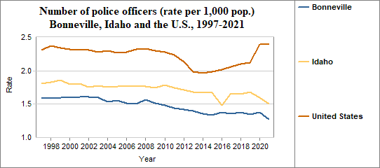- There were 1.3 police officers per 1,000 people in 2021, compared to 1.5 in Idaho.
