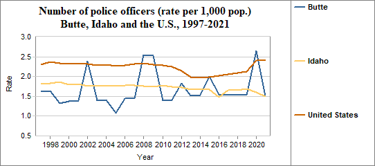 - There were 1.5 police officers per 1,000 people in 2021, compared to 1.5 in Idaho.