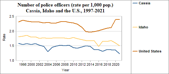 - There were 1.2 police officers per 1,000 people in 2021, compared to 1.5 in Idaho.