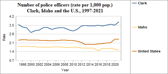 - There were 3.8 police officers per 1,000 people in 2021, compared to 1.5 in Idaho.
