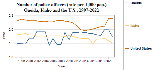 - There were 1.7 police officers per 1,000 people in 2021, compared to 1.5 in Idaho.