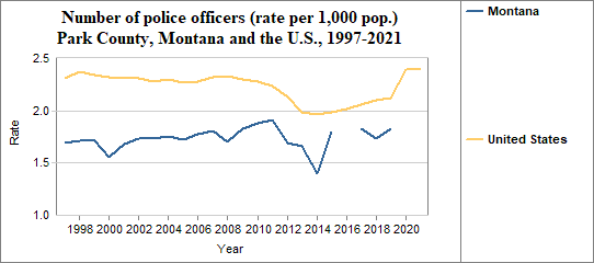 This indicator is calculated by dividing the number of sworn police officers by the total population. We multiply the result by 1,000. According to the FBI, sworn officers meet the following criteria: “they work in an official capacity, they have full arrest powers, they wear a badge (ordinarily), they carry a firearm (ordinarily), and they are paid from governmental funds set aside specifically for payment of sworn law enforcement representatives.” In counties with relatively few people, a small change in the number of officers may have a significant effect on rates from year to year.