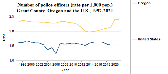 This indicator is calculated by dividing the number of sworn police officers by the total population. We multiply the result by 1,000. According to the FBI, sworn officers meet the following criteria: “they work in an official capacity, they have full arrest powers, they wear a badge (ordinarily), they carry a firearm (ordinarily), and they are paid from governmental funds set aside specifically for payment of sworn law enforcement representatives.” In counties with relatively few people, a small change in the number of officers may have a significant effect on rates from year to year.