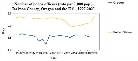This indicator is calculated by dividing the number of sworn police officers by the total population. We multiply the result by 1,000. According to the FBI, sworn officers meet the following criteria: “they work in an official capacity, they have full arrest powers, they wear a badge (ordinarily), they carry a firearm (ordinarily), and they are paid from governmental funds set aside specifically for payment of sworn law enforcement representatives.” In counties with relatively few people, a small change in the number of officers may have a significant effect on rates from year to year.