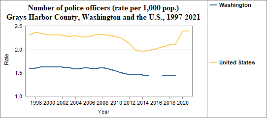 This indicator is calculated by dividing the number of sworn police officers by the total population. We multiply the result by 1,000. According to the FBI, sworn officers meet the following criteria: “they work in an official capacity, they have full arrest powers, they wear a badge (ordinarily), they carry a firearm (ordinarily), and they are paid from governmental funds set aside specifically for payment of sworn law enforcement representatives.” In counties with relatively few people, a small change in the number of officers may have a significant effect on rates from year to year.