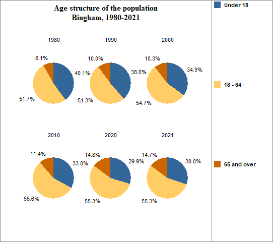 - 30.0 percent of the population was under 18 in 2021, compared to 24.7 percent in Idaho