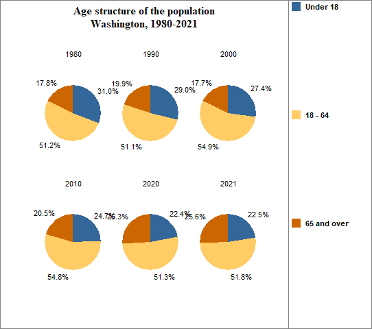- 51.8 percent of the population was 18 to 64 years old in 2021, compared to 58.7 percent in Idaho