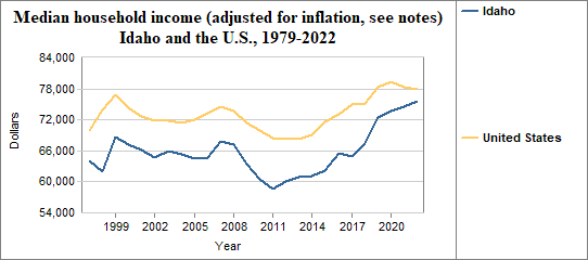 Median household income is the level of income at which half the population has lower incomes and half has higher incomes. Here, we provide information on real median household income, which means the data have been adjusted for inflation. In Idaho median household income (adjusted for inflation) . . .