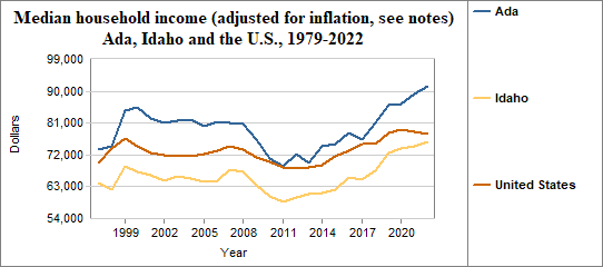 Median household income is the level of income at which half the population has lower incomes and half has higher incomes. Here, we provide information on real median household income, which means the data have been adjusted for inflation. In Ada median household income (adjusted for inflation) . . .