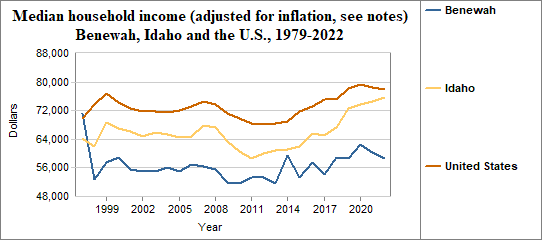 Median household income is the level of income at which half the population has lower incomes and half has higher incomes. Here, we provide information on real median household income, which means the data have been adjusted for inflation. In Benewah median household income (adjusted for inflation) . . .