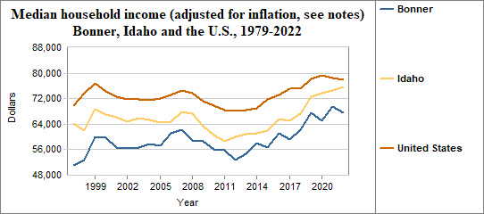 Median household income is the level of income at which half the population has lower incomes and half has higher incomes. Here, we provide information on real median household income, which means the data have been adjusted for inflation. In Bonner median household income (adjusted for inflation) . . .