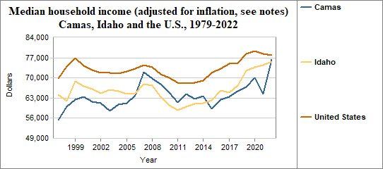 Median household income is the level of income at which half the population has lower incomes and half has higher incomes. Here, we provide information on real median household income, which means the data have been adjusted for inflation. In Camas median household income (adjusted for inflation) . . .