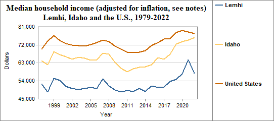 Median household income is the level of income at which half the population has lower incomes and half has higher incomes. Here, we provide information on real median household income, which means the data have been adjusted for inflation. In Lemhi median household income (adjusted for inflation) . . .