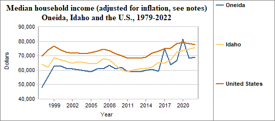 Median household income is the level of income at which half the population has lower incomes and half has higher incomes. Here, we provide information on real median household income, which means the data have been adjusted for inflation. In Oneida median household income (adjusted for inflation) . . .