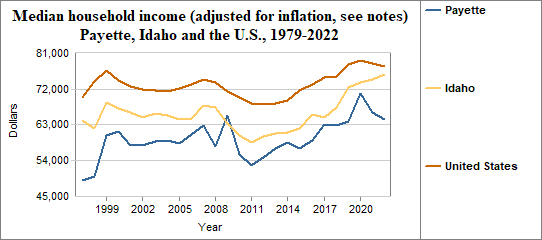 Median household income is the level of income at which half the population has lower incomes and half has higher incomes. Here, we provide information on real median household income, which means the data have been adjusted for inflation. In Payette median household income (adjusted for inflation) . . .