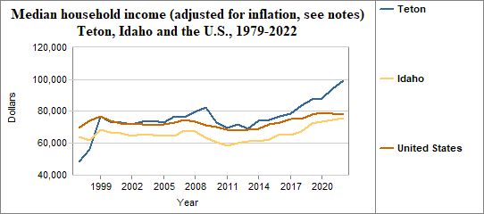 Median household income is the level of income at which half the population has lower incomes and half has higher incomes. Here, we provide information on real median household income, which means the data have been adjusted for inflation. In Teton median household income (adjusted for inflation) . . .