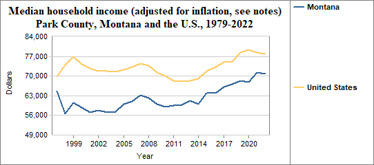 Median household income is the level of income at which half the population has lower incomes and half has higher incomes. Here, we provide information on real median household income, which means the data have been adjusted for inflation. In Park County median household income (adjusted for inflation) . . .