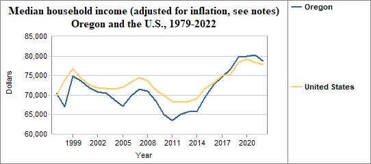 Median household income is the level of income at which half the population has lower incomes and half has higher incomes. Here, we provide information on real median household income, which means the data have been adjusted for inflation. In Oregon median household income (adjusted for inflation) . . .