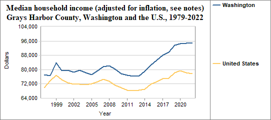 Median household income is the level of income at which half the population has lower incomes and half has higher incomes. Here, we provide information on real median household income, which means the data have been adjusted for inflation. In Grays Harbor County median household income (adjusted for inflation) . . .