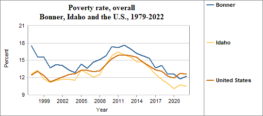 The poverty rate is the percentage of people living below the poverty level or “threshold.” Each year, the U.S. Office of Management and Budget establishes a series of poverty thresholds for different family sizes and ages of household heads. Among Bonner residents, the overall poverty rate . . .