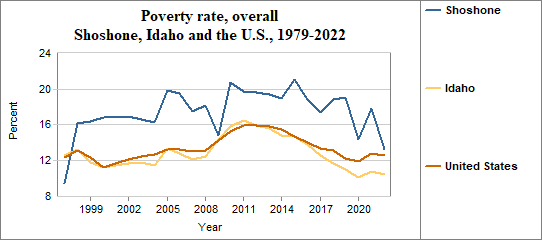 The poverty rate is the percentage of people living below the poverty level or “threshold.” Each year, the U.S. Office of Management and Budget establishes a series of poverty thresholds for different family sizes and ages of household heads. Among Shoshone residents, the overall poverty rate . . .