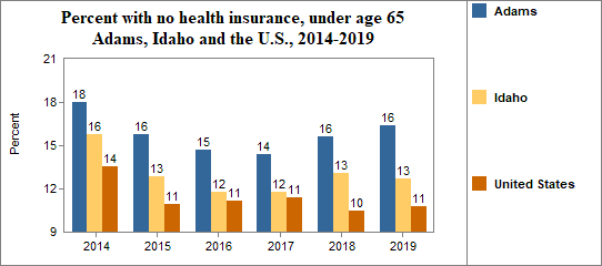 - 16.4 percent of the population under age 65, or 487.0 people, had no health insurance coverage compared to 12.7 percent in all of Idaho;