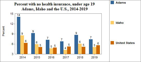 - 7.4 percent of children under the age of 19, or 56 children, had no health insurance coverage compared to 5.1 percent of all children in Idaho;