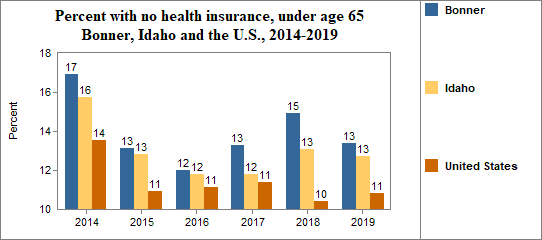 - 13.4 percent of the population under age 65, or 4,535.0 people, had no health insurance coverage compared to 12.7 percent in all of Idaho;