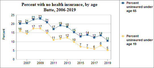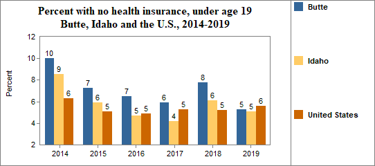 - 5.3 percent of children under the age of 19, or 34 children, had no health insurance coverage compared to 5.1 percent of all children in Idaho;