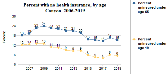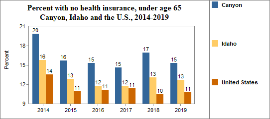 - 15.3 percent of the population under age 65, or 29,380.0 people, had no health insurance coverage compared to 12.7 percent in all of Idaho;