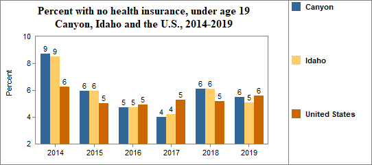 - 5.5 percent of children under the age of 19, or 3,576 children, had no health insurance coverage compared to 5.1 percent of all children in Idaho;