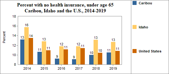 - 10.5 percent of the population under age 65, or 620.0 people, had no health insurance coverage compared to 12.7 percent in all of Idaho;