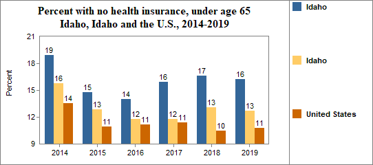 - 16.2 percent of the population under age 65, or 1,834.0 people, had no health insurance coverage compared to 12.7 percent in all of Idaho;