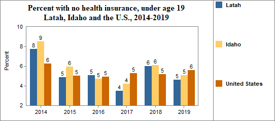 - 4.6 percent of children under the age of 19, or 356 children, had no health insurance coverage compared to 5.1 percent of all children in Idaho;
